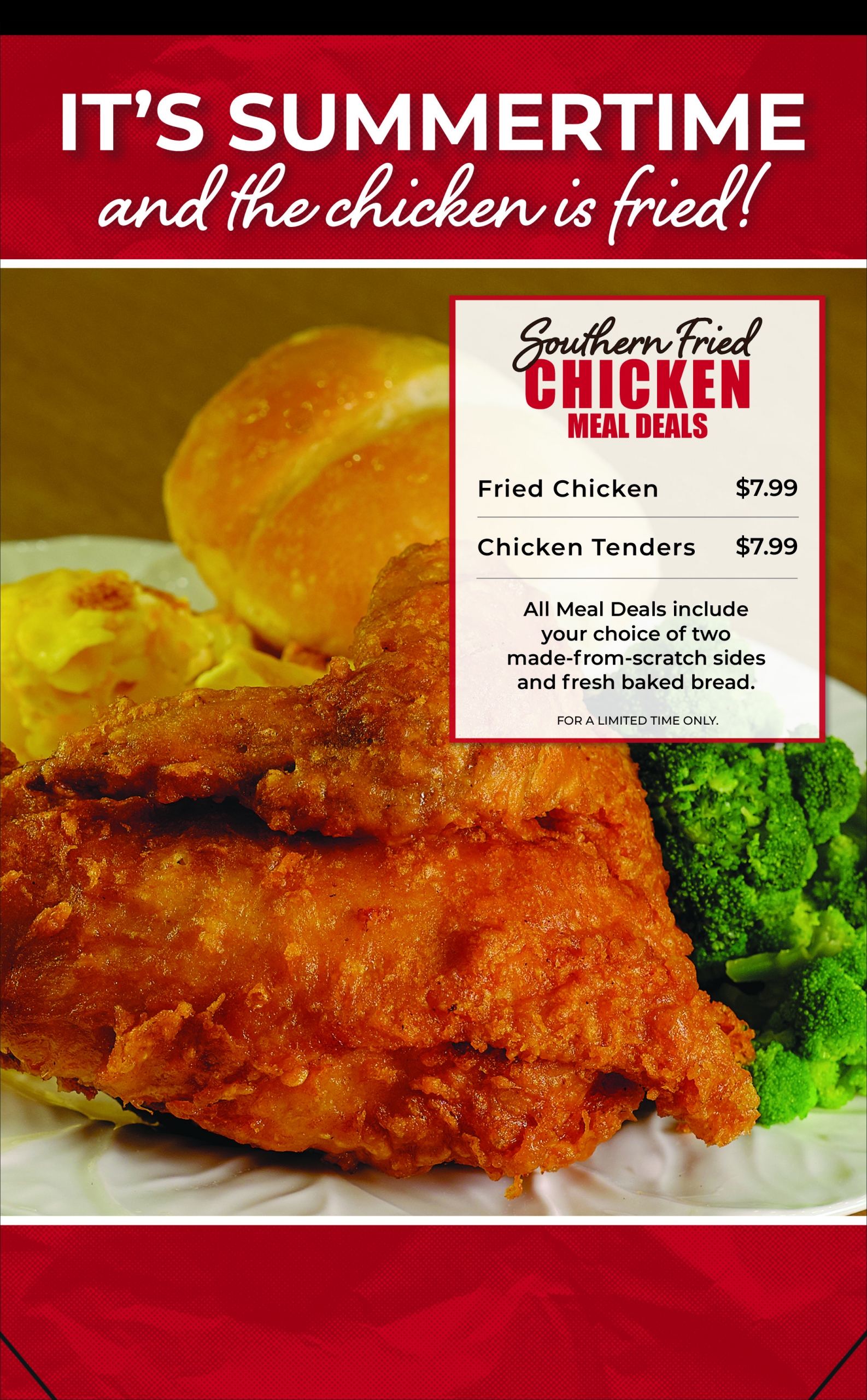 Our Fried Chicken Meal Deal comes with your choice of breast/wing or leg/thigh, 2 sides and a bread for $7.99