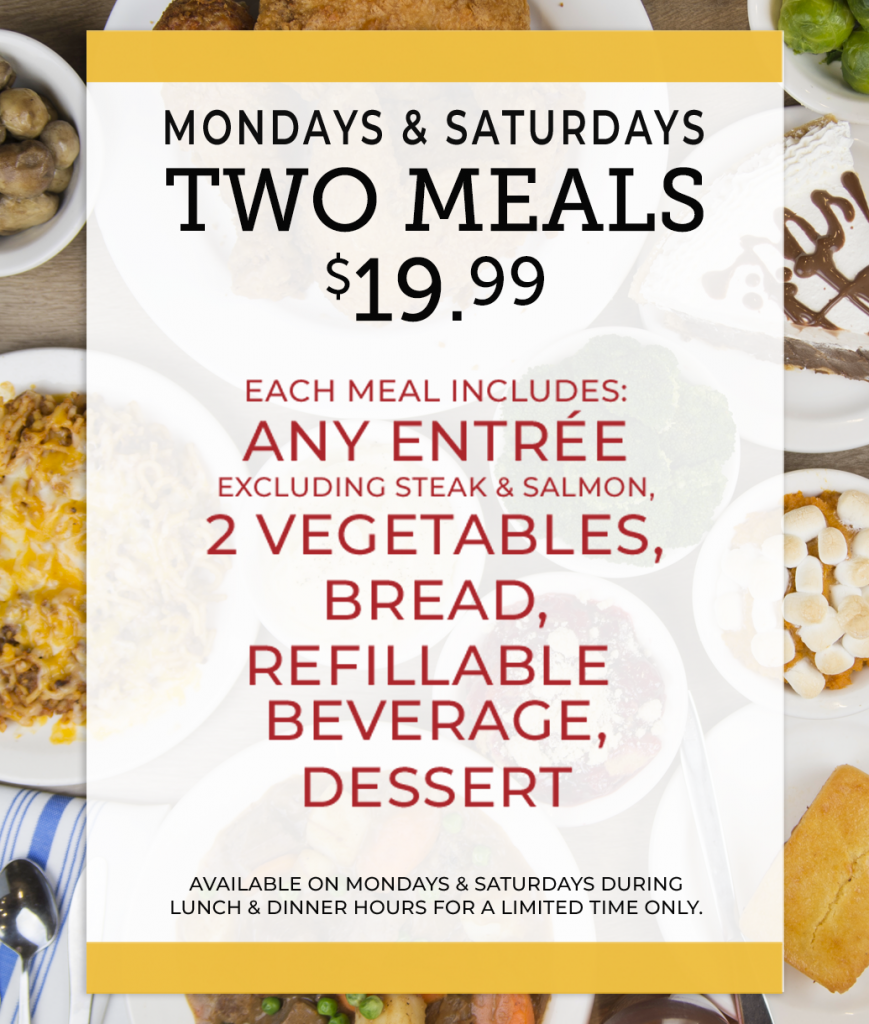Every Saturday and Monday, get two complete meals for one low price. Each meal includes an entree, two scratch-made sides, bread, a beverage, and dessert!